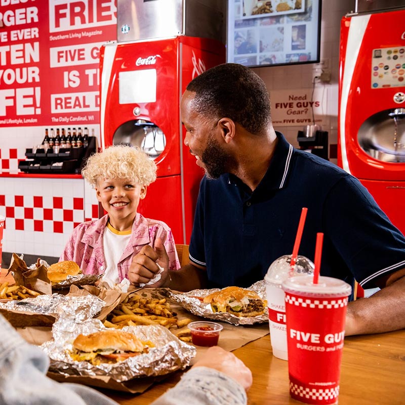 Real is the name of the game at Five Guys. The fries are hand-cut, the burgers are made to order, and the shake mix-ins are the highest quality. Real burgers and fries are just what we do.